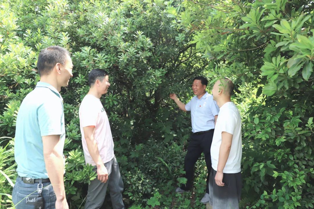 (圖為大田村村支書(shū)與駐村工作隊(duì)一起查看今年楊梅基地掛果情況)